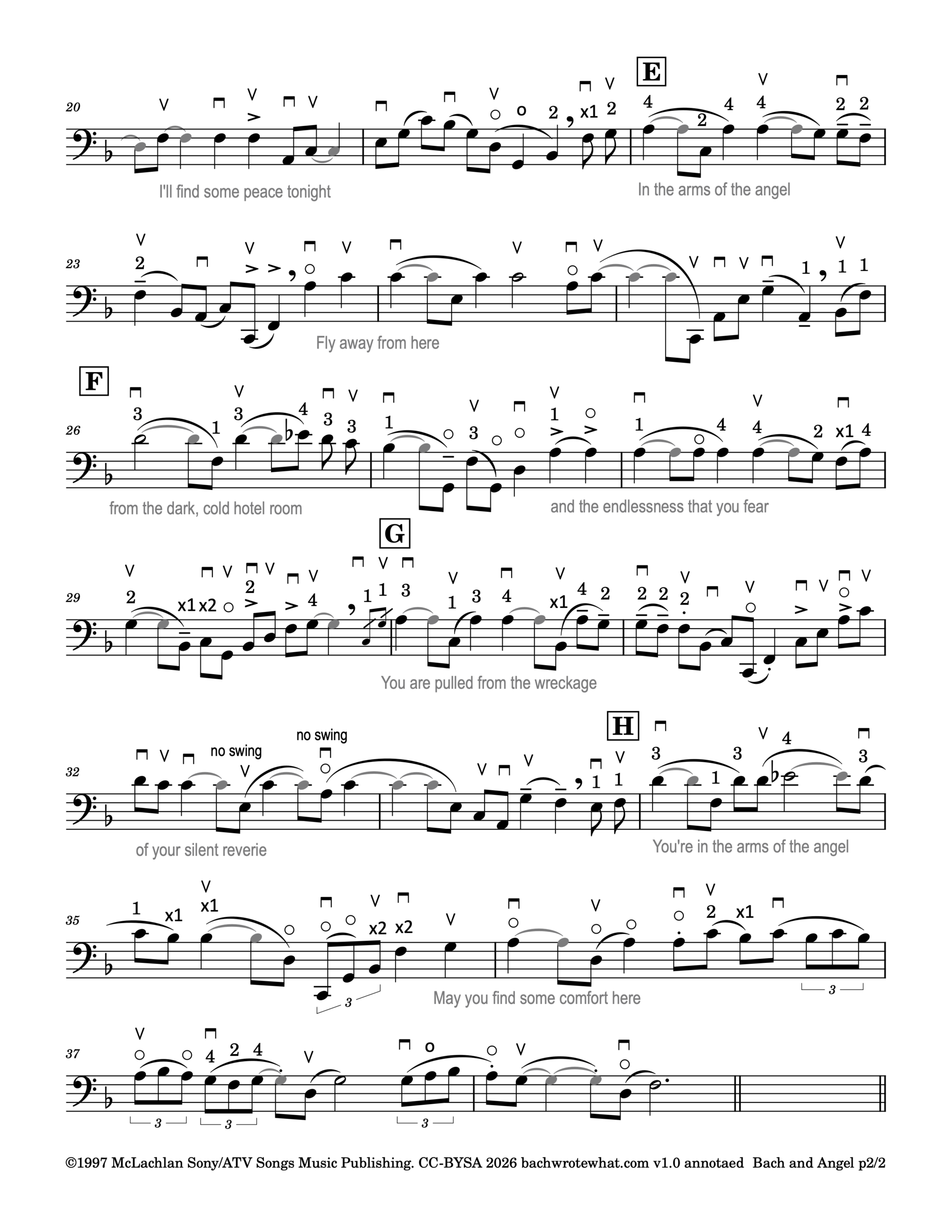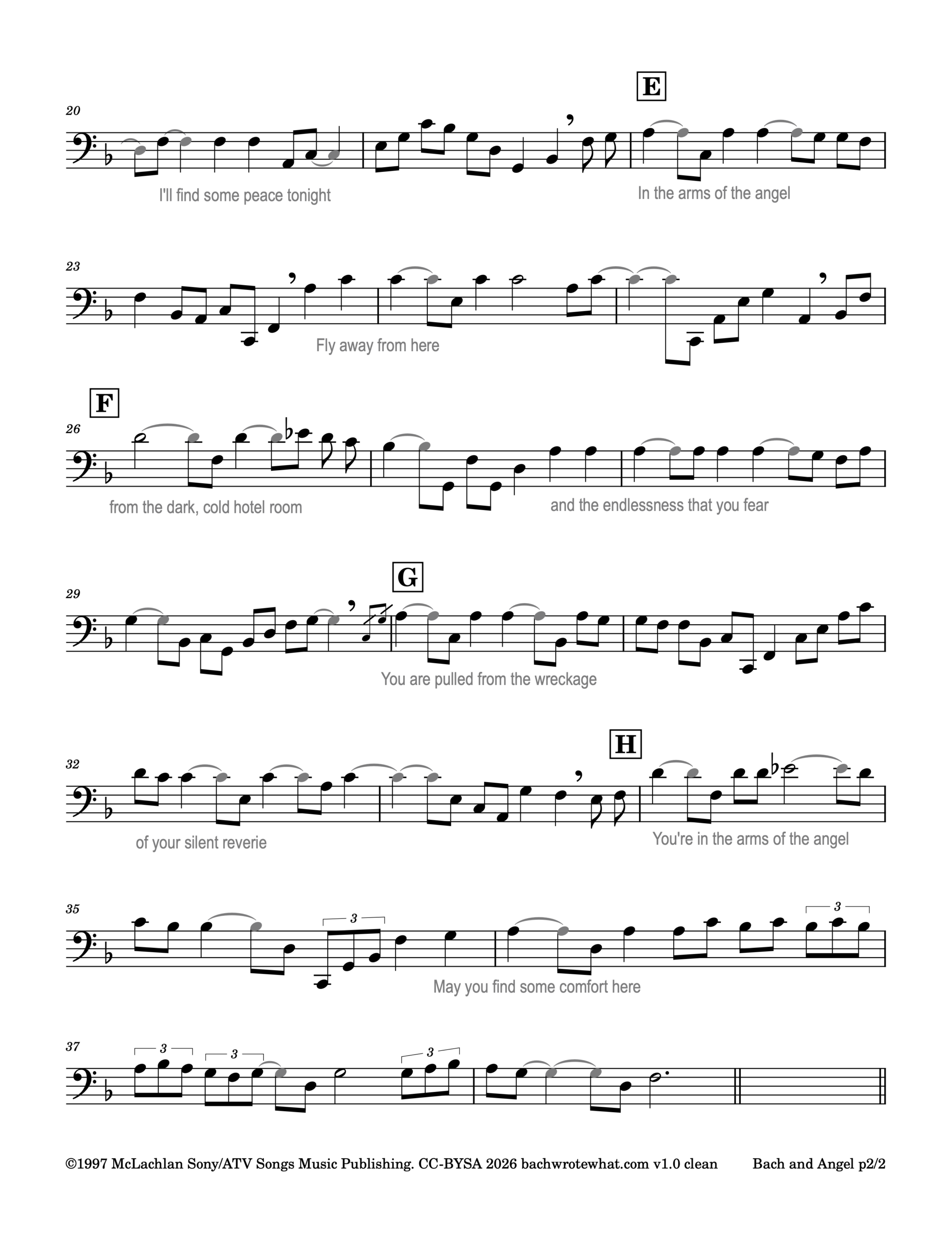 This 2004 vocal-piano version has now been recomposed into a self-accompanied cello piece in F major, a transposition chosen to take advantage of the cello’s open strings. Unlike past recompositions of popular music at Project BachWroteWhat that bury the source material as hidden easter eggs, the original melody of “Angel” comes through clearly throughout.
